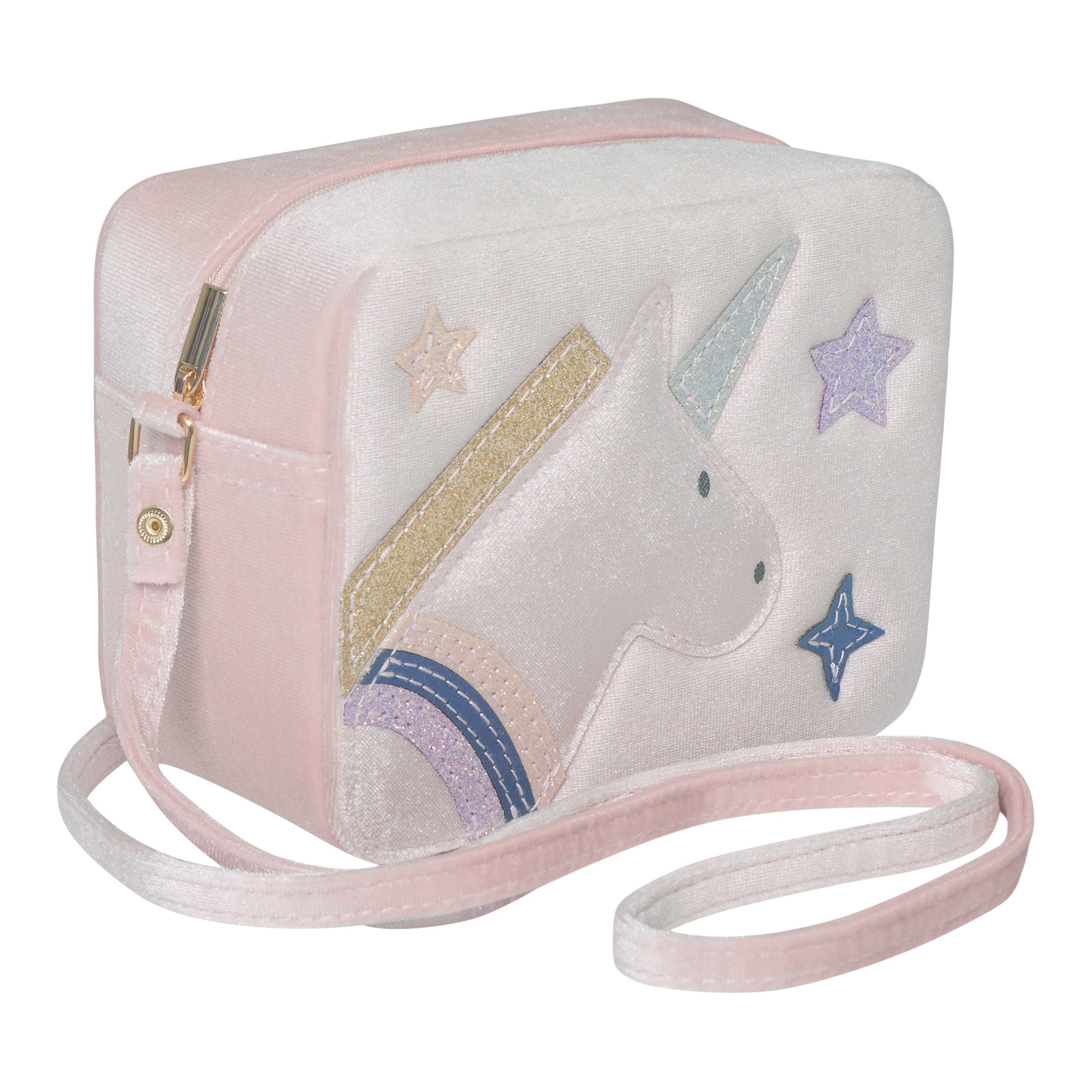 - Hard shell bag crafted from soft pink velvet featuring a unicorn design in a mix of glitter and metallic fabrics