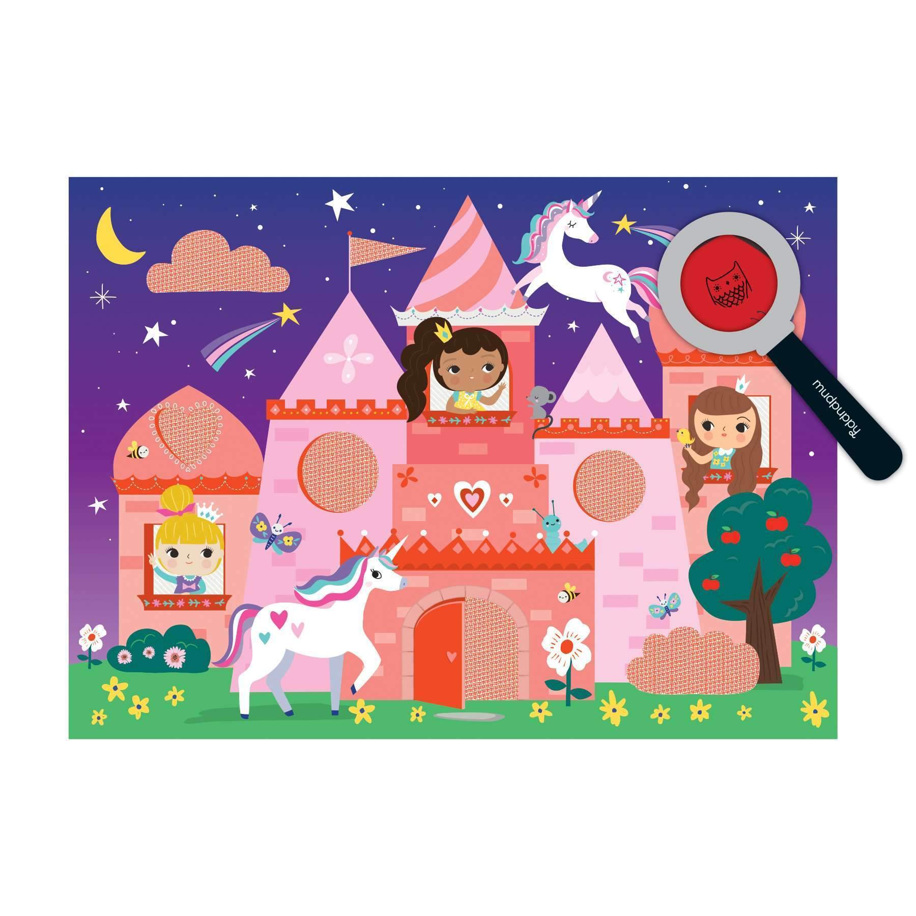 Unicorn Castle Secret Pictures Puzzle from Mudpuppy is a 42 piece puzzle for ages 4 and up featuring a colorful illustration of unicorns at the royal castle. The puzzle includes a revealing wand to place over parts of the puzzle image to view secret images.